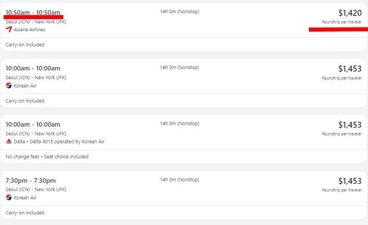 위에 요금은 달러로 되어 있는데 한국돈으로 따지면 약 185만 원 정도에 왕복하는 겁니다. 이때에는 성수기 요금이 적용되기 때문에 여행을 확정하고, 숙소를 구하는 대로 바로 비행기 표도 예약해야 합니다.